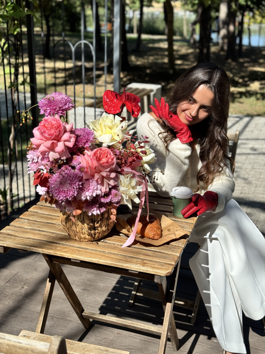 A basket with French roses, bright anthurium, and seasonal chrysanthemums will warm the recipient's soul like warm autumn sunbeams and bring pleasant emotions.