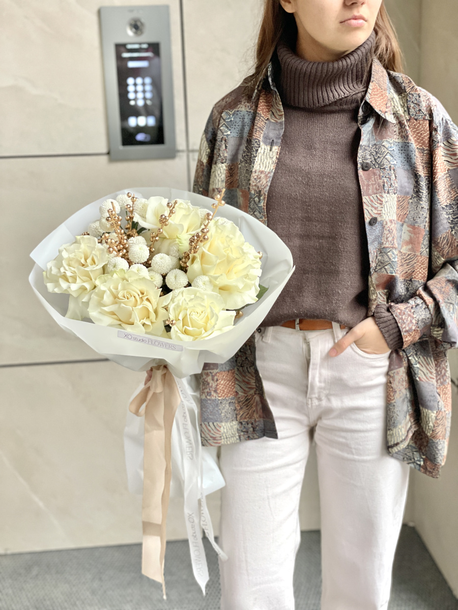 A refined white winter bouquet with a golden accent of dyed ilex in neat, stylish white packaging. You can give this bouquet to your beloved mother or wife, as well as to an employee or colleague for any holiday. XOstudioFLOWERS florists will always assemble and carefully deliver the bouquet of your choice.