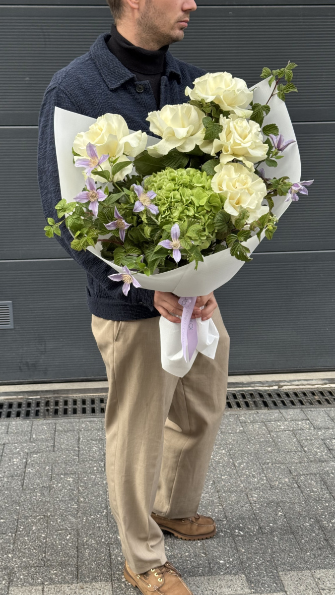 An original asymmetrical bouquet with hydrangeas, clematis, and French roses—a delicate and expressive composition with unusual texture and lively dynamics. XOstudioFLOWERS florists always surprise with their creative approach to creating the best bouquets.