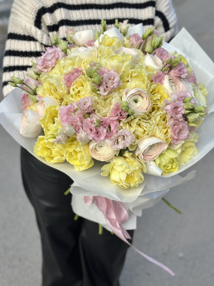 Un buchet premium cu cele mai frumoase flori de primăvară – lalele în formă de bujor, ranunculi mari și eustoma crețată, ca o bomboană. Buchetul va încânta prin rezistența sa și va decora orice interior cu frumusețea și parfumul delicat al primăverii!