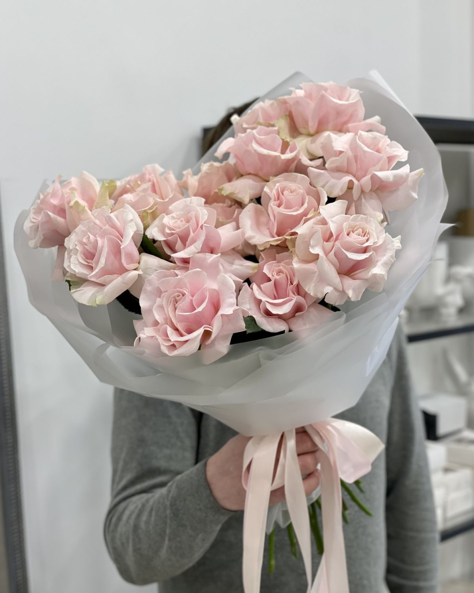Элегатный букет из французских розовых роз с бархатными волнистыми лепестками чудесный знак внимания для близкого человека. Сорт этих рох Pink Mondial всегда долго радует своей стойкостью и пастельным розовым цветов.