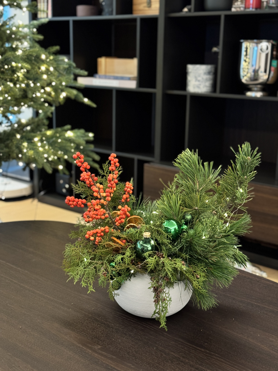 An elegant composition of fresh pine needles in a white ceramic pot. The natural texture of the greenery, deep green accents, and bright ilex create a harmonious festive look that looks great in both home and commercial interiors. If desired, the composition can be complemented with a battery-powered garland with diodes to enhance the atmosphere of soft glow and winter coziness.