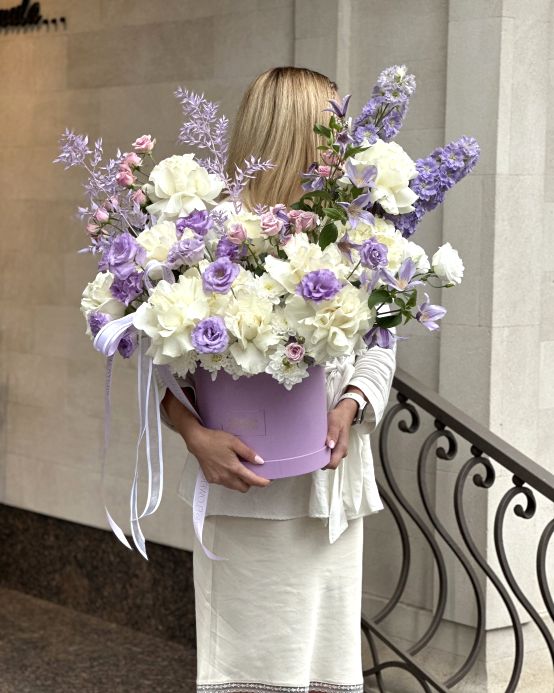 A floral box is perceived as an exclusive and intriguing format. The stems are hidden deep inside, leaving only the cheerful tops visible. A hat box looks like an accessory: easy to hold in hand, to gift directly on the street, or to place in a car. There is a playful element in this, which makes the gift especially personal. Nothing extra: just flowers, beautifully arranged in a luxurious hat box. The bouquet is perfect for romantic occasions or friendly gestures, when you want to show attention without excessive formality.