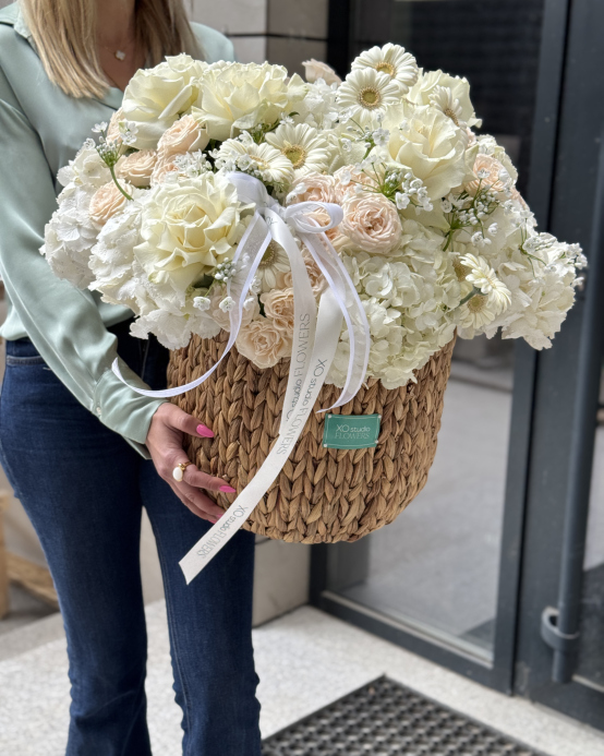 So, we come to the conclusion that a basket is the choice for significant events: anniversaries, weddings, corporate events, or official gatherings. It emphasizes the importance of the occasion and aligns with tradition. However, you don’t need to be that strict – you can buy flowers in a small basket, according to your own preference, for more informal occasions.