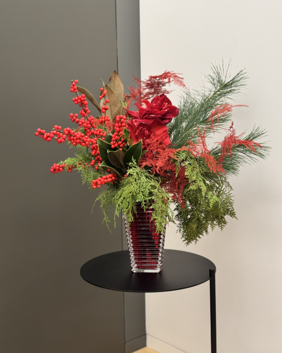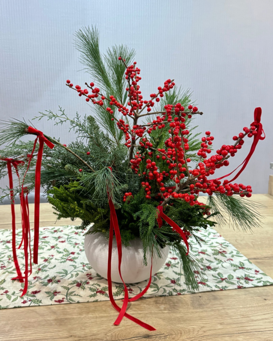 In winter bouquets, ilex is used either as a dense background or as a single expressive accent. Ilex harmonizes beautifully with fiery amaryllis, highlights pure white roses and chrysanthemums, and feels perfectly at home in Christmas baskets and boxes with pine and seasonal flowers, giving interiors a festive and playful mood. In decorative table arrangements, ilex adds light, atmosphere, and even stimulates the appetite for a delicious holiday meal.