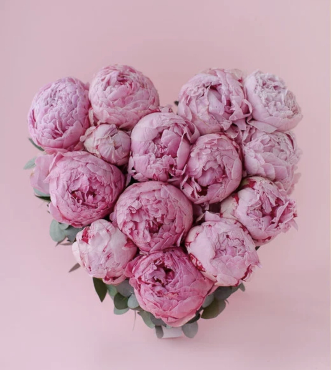 Compoziția pentru Ziua Îndrăgostiților, realizată din bujori și eucalipt, va surprinde destinatarul și îi va oferi sentimente delicate.