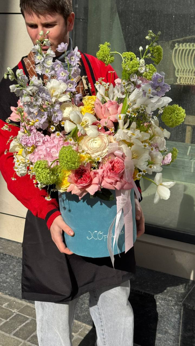Such a composition perfectly holds its shape and stands for a long time, as the flowers do not lose access to water for a minute from the moment the composition is assembled. This is a real work of art of floristry, which will please the recipient for many days after handing it over.