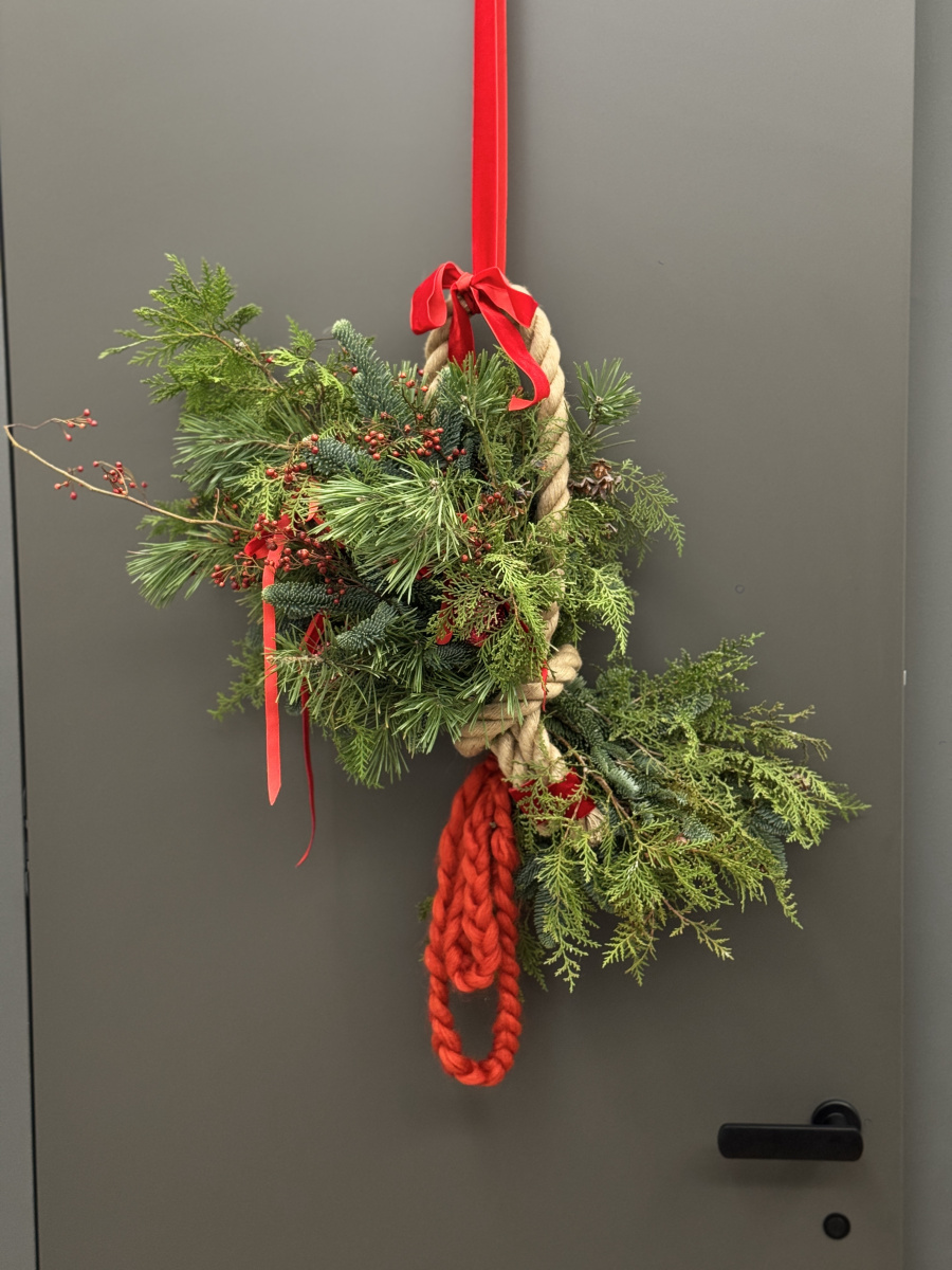 Новый вид венка на дверь: венок в форме петельки. Стильное украшение двери. Вы можете повесить ткой венок как снаружи двери, так и с внуренней части. К каждому венку мы дарим специальный крючок на дверь, чтобы облегчить его крепёж.