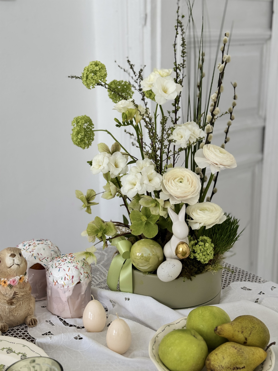 Ceramic cachepot / decorative Easter eggs / tulip / freesia / muscari / alstrameria / ranunculus / forsythia
