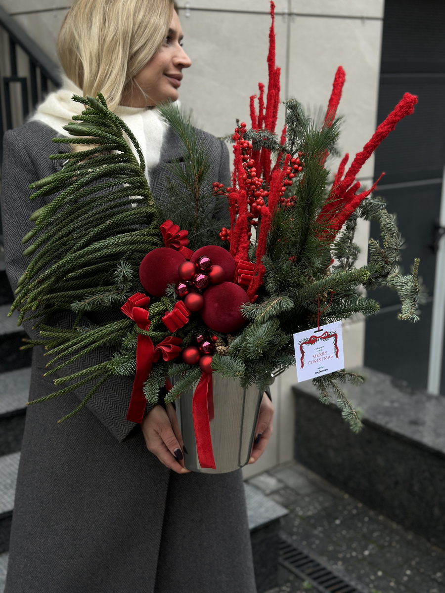 araucaria / pine / cedar / nobilis / velvet and glass Christmas tree decorations / velvet ribbon / snow-covered red branches